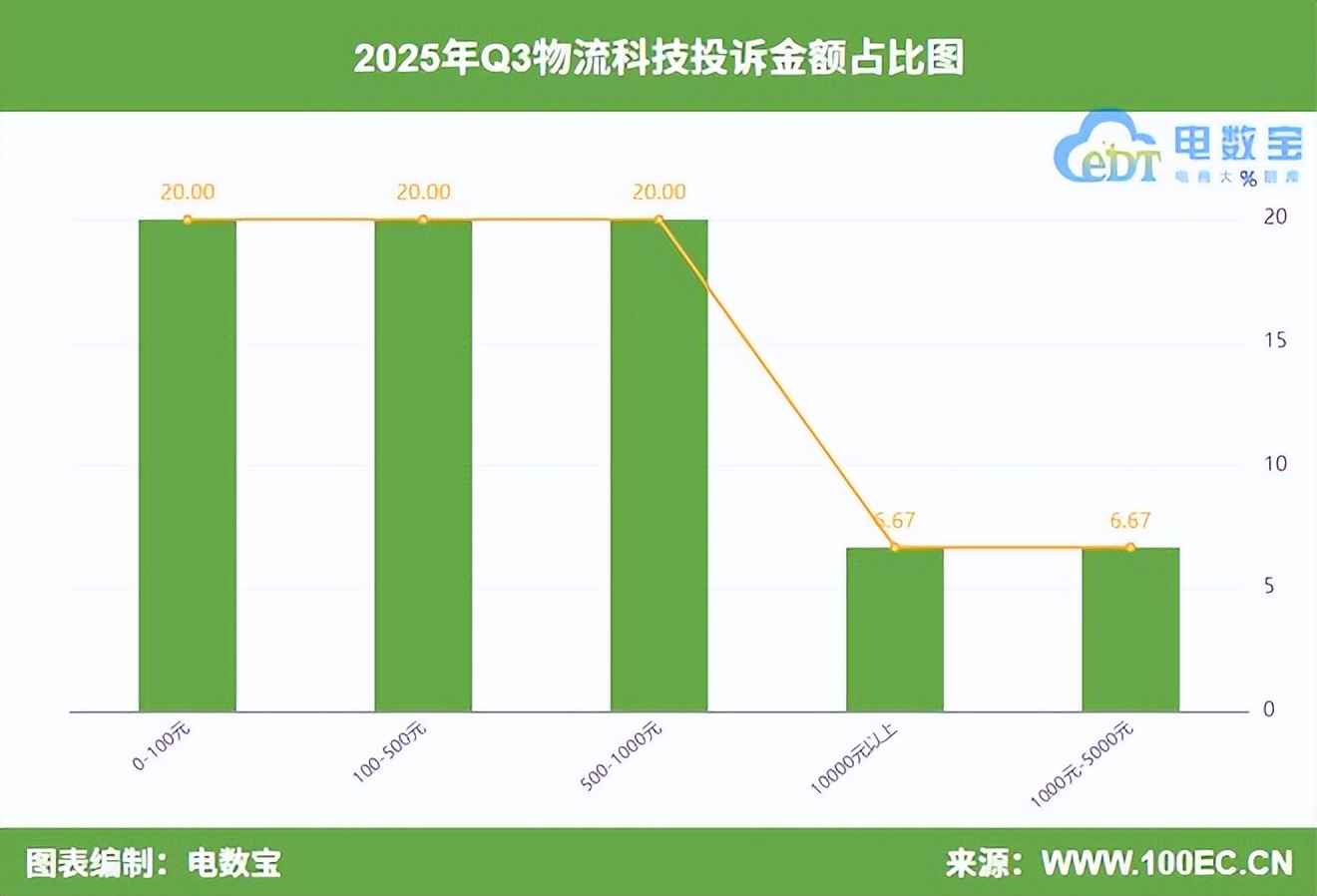 此外,物流科技投诉金额主要分布为:0-100元(20.00%)、100-500元(20.00%)、500-1000元(20.00%)、10000元以上(6.67%)、1000-5000元(6.67%)。