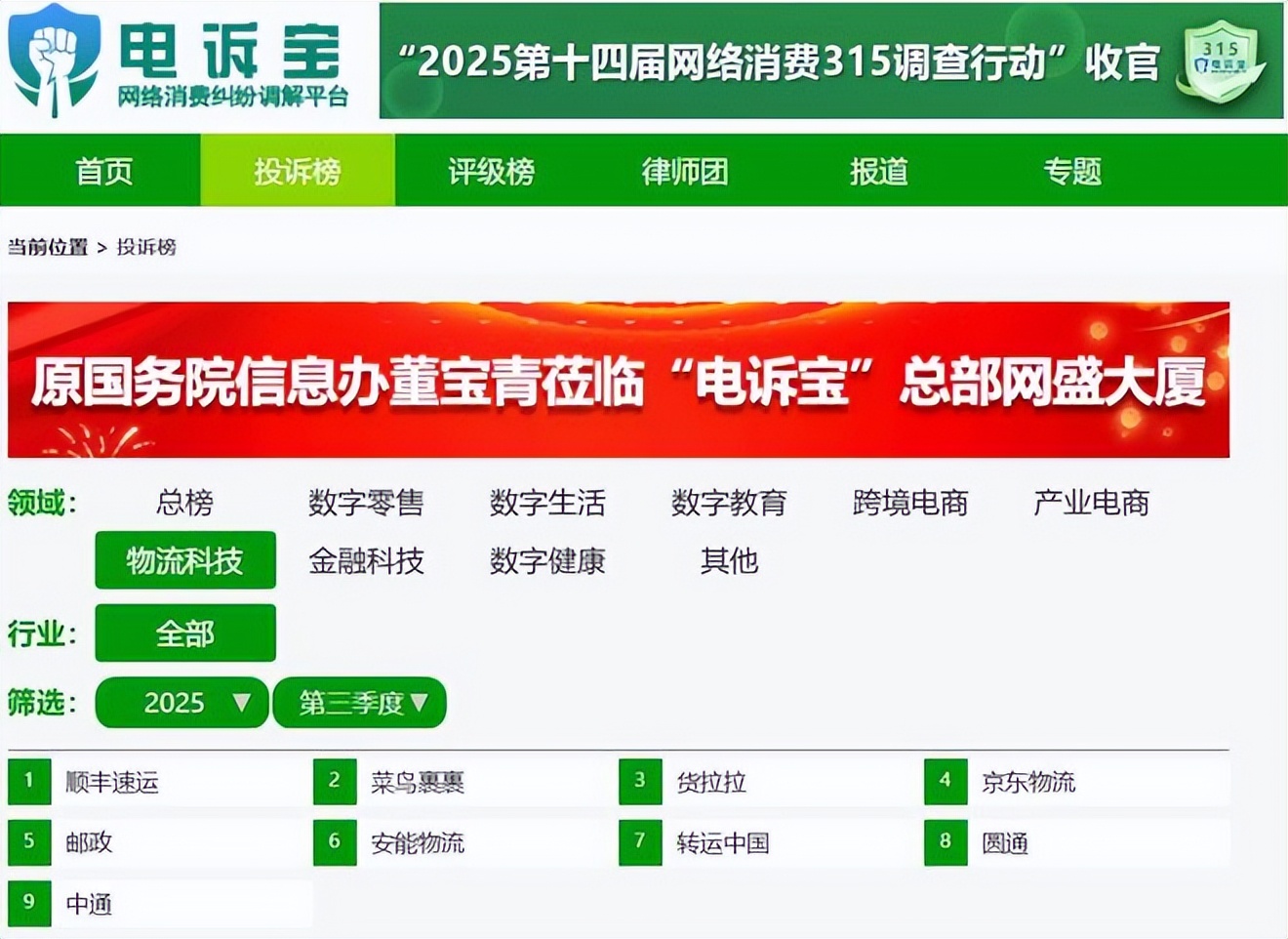 根据“电诉宝”2025年三季度受理的物流科技领域用户有效投诉显示,投诉量排名依次为:顺丰速运、菜鸟裹裹、货拉拉、京东物流、邮政、安能物流、转运中国、圆通、中通。此前,申通快递、达达、59转运、北京京邦达贸易有限公司、极兔速递等也遭遇过类似投诉。