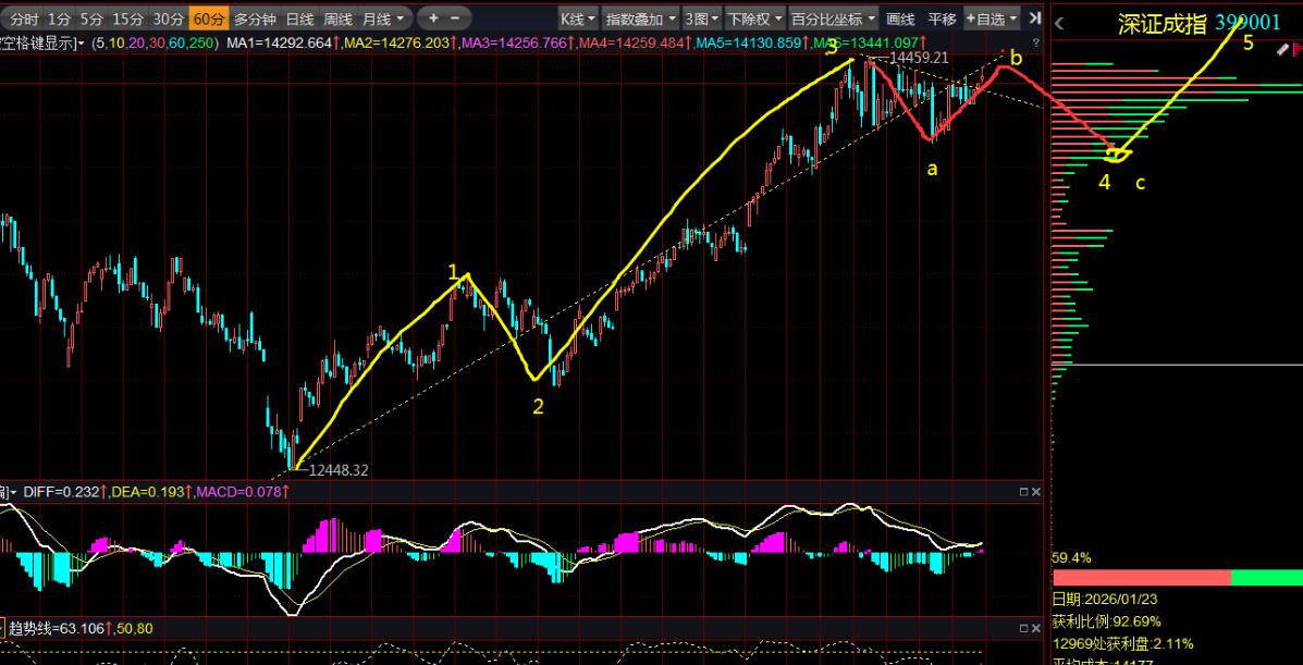 如果切换到深圳市场的60分钟走势图,这种结构可能表现得更加直观。从大趋势来看,我一直认为,一旦牛市格局确立,短期的打压往往难以改变其内在动力,每一次回调反而可能成为再次布局的机会。这与熊市中的逻辑正好相反——在熊市里,利好常常成为出货的时机。回到当前市场,我们似乎正处在牛市的中段,赚钱效应逐步扩散,不少之前长期在底部徘徊的标的,也开始慢慢活跃起来。因此,对于下周,我个人倾向于认为价值蓝筹板块有望迎来一定修复,而题材股也会继续轮动表现,大盘指数整体仍有冲高的潜力。