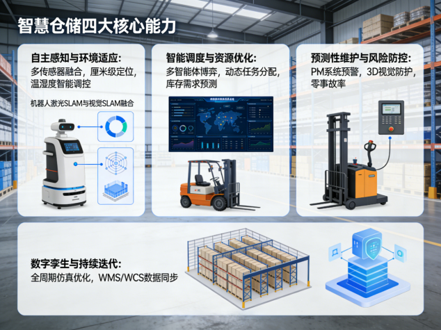 二、核心能力:从单点优化到全链智能的突破AI技术的渗透使智慧仓储具备四大核心能力,推动其从“局部改进”向“系统重构”跨越。