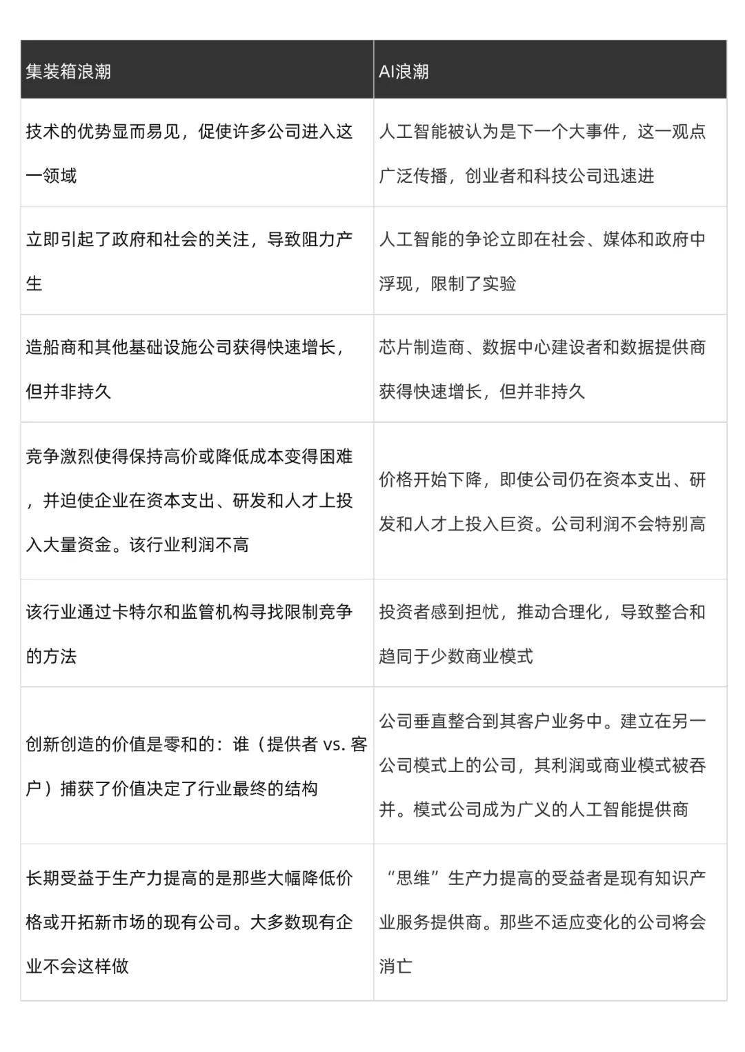 作者认为,AI更像是集装箱技术。一出来就被巨头盯死了,没啥自由试错空间。而且这个行业竞争太激烈了,利润薄得可怜。集装箱当年一火,所有航运公司都跟风做,最后打价格战,赚的钱还不够投设备的。