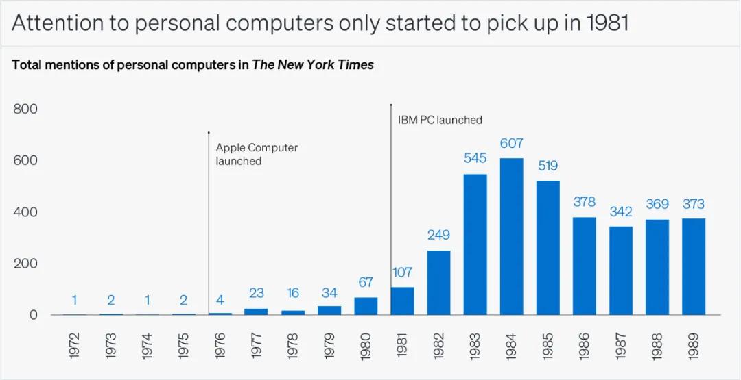 事后看来,我们赋予个人电脑先驱们先知而非远见者的光环。但当时除了少数早期使用者外,根本无人关注。直到 1981 年 8 月 IBM 推出个人电脑后,《纽约时报》等主流媒体才认真对待这一事物。1976 年苹果公司创立时,全年《纽约时报》仅四次提及个人电脑。 显然,只有那些疯子、异类、反叛者和麻烦制造者们在密切关注。