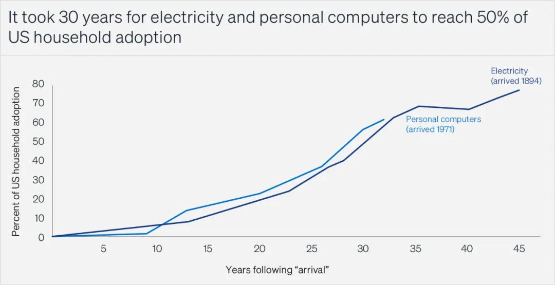 电力和个人电脑达到美国家庭50%采用率花了30年时间