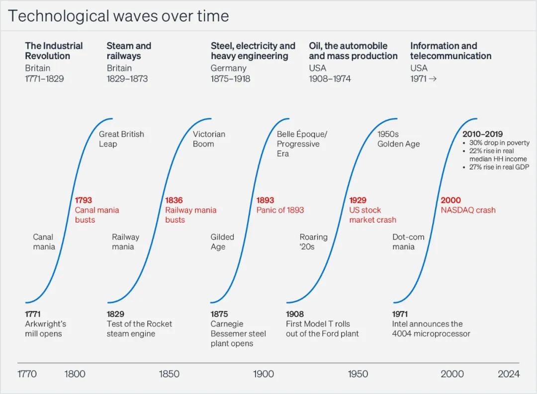 当革命性技术催生出一波波可投资的创新企业时,企业家和投资者便能积累巨额财富。想想铁路、贝塞麦炼钢法、电力、内燃机或微处理器——每一项技术都如同烟花厂里迸溅的火星,引爆了长达数十年的连锁创新,渗透到社会的每个角落,并将一批新的发明家和投资者推向权力、影响力与财富的巅峰。
