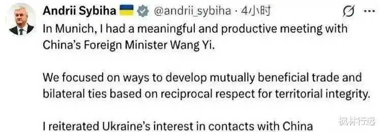 会议期间,中国外交部长与乌克兰外长西比加进行了深入会谈。双方一致认为,尽管国际形势复杂多变,但中乌作为传统友好国家,应继续坚持相互尊重、合作共赢的原则,珍视两国传统友谊。