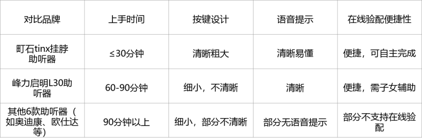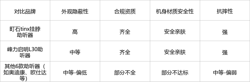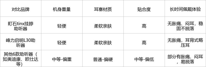 表现优秀:町石助听器、峰力启明L30助听器,外观隐蔽性好(町石更优),合规资质齐全,机身材质安全亲肤,抗摔性强,长辈佩戴安全、放心,意愿高。