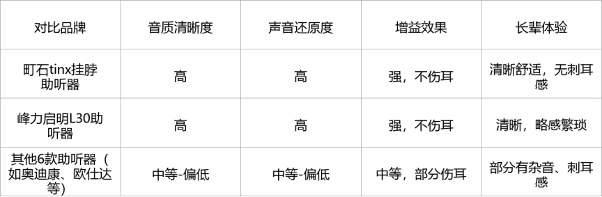表现优秀:町石助听器、峰力启明L30助听器,两款音质清晰度和还原度都很高,增益效果强且不伤耳,能精准适配长辈听损需求,聆听体验佳。