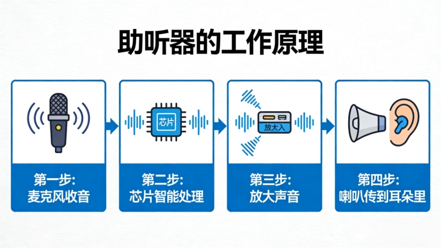 助听器不是“治病”的,核心作用是辅助聆听,帮长辈放大声音、过滤杂音,让长辈能清晰听清家人说话、电视声音和环境音,改善交流质量,提升生活品质;它的原理很简单,就像一个“智能声音调节器”,通过麦克风捕捉声音,经过芯片处理放大有用人声、过滤无用杂音,再把清晰声音传到耳朵里,操作简单就能轻松听清。佩戴需有适应期,循序渐进使用,才能让长辈更好地适应。