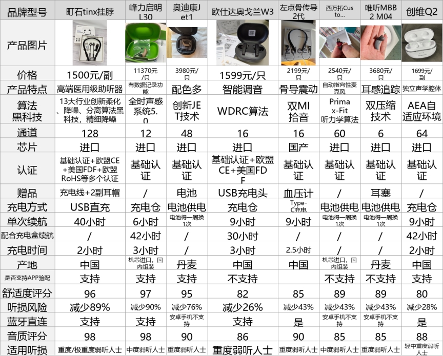 为了让大家快速看清这8款助听器的核心差异,我整理了实测参数对比表,所有数据均为1个月实测得出,不掺假、不虚标,重点聚焦增益范围、降噪效果、续航时间、操作方式、佩戴重量等关键指标,帮大家初步筛选,也能更清晰了解助听器价格表2026款的具体差异。