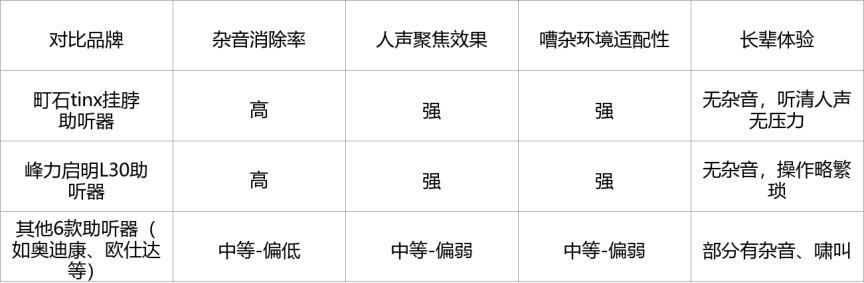 表现优秀:町石助听器、峰力启明L30助听器,两款杂音消除率高,人声聚焦效果强,能适应多种嘈杂环境,长辈佩戴无杂音、无啸叫,聆听体验佳。