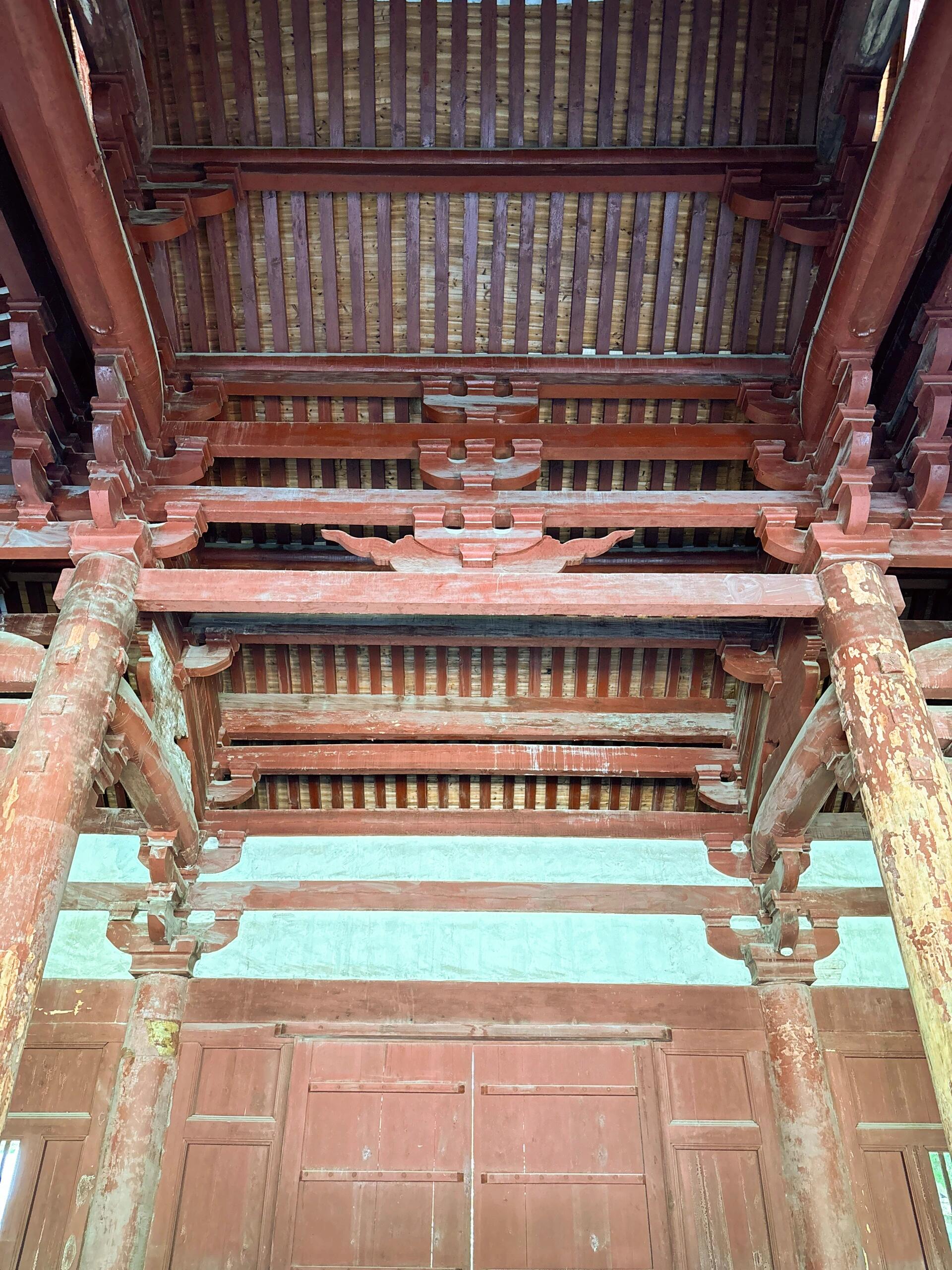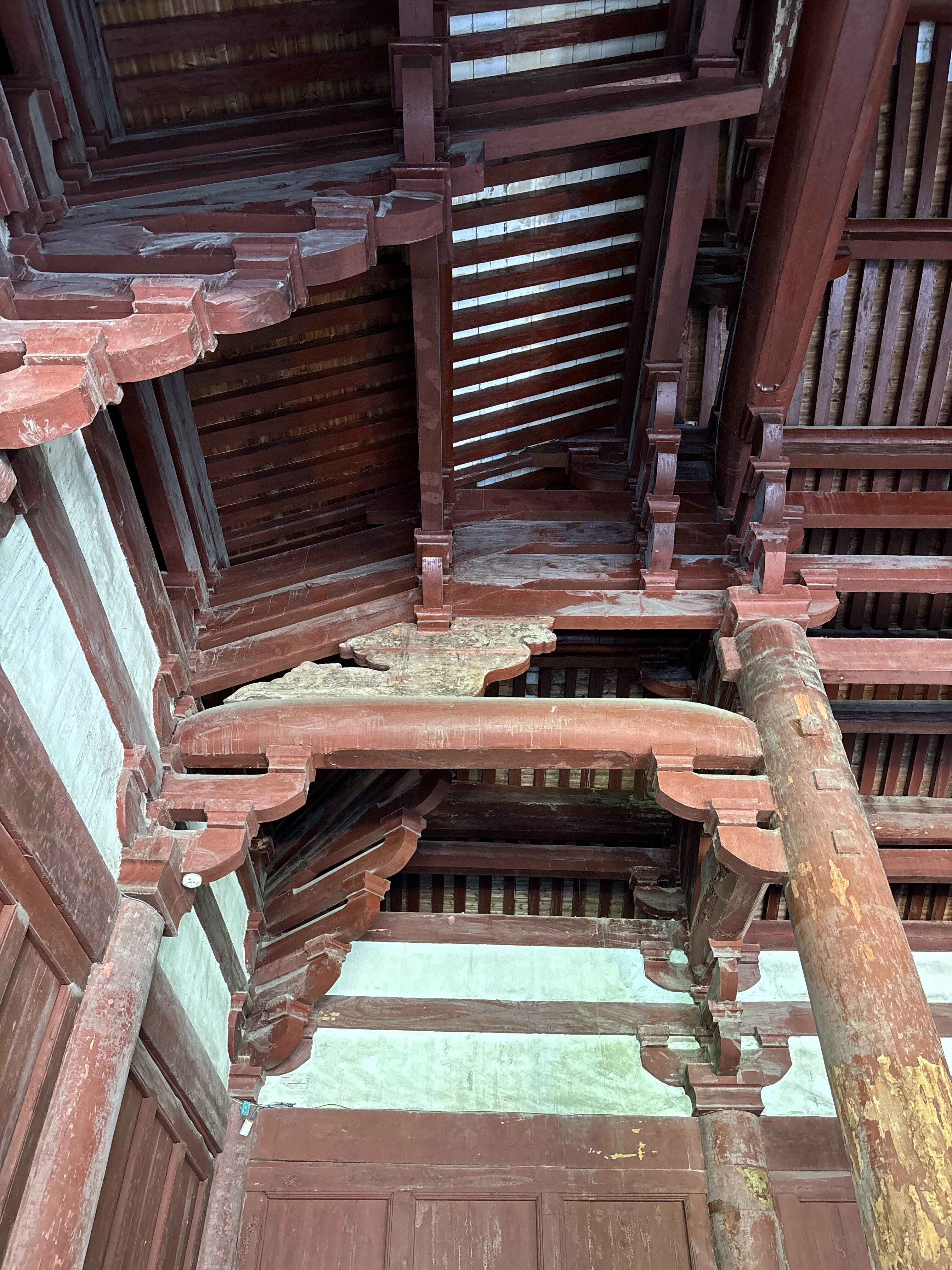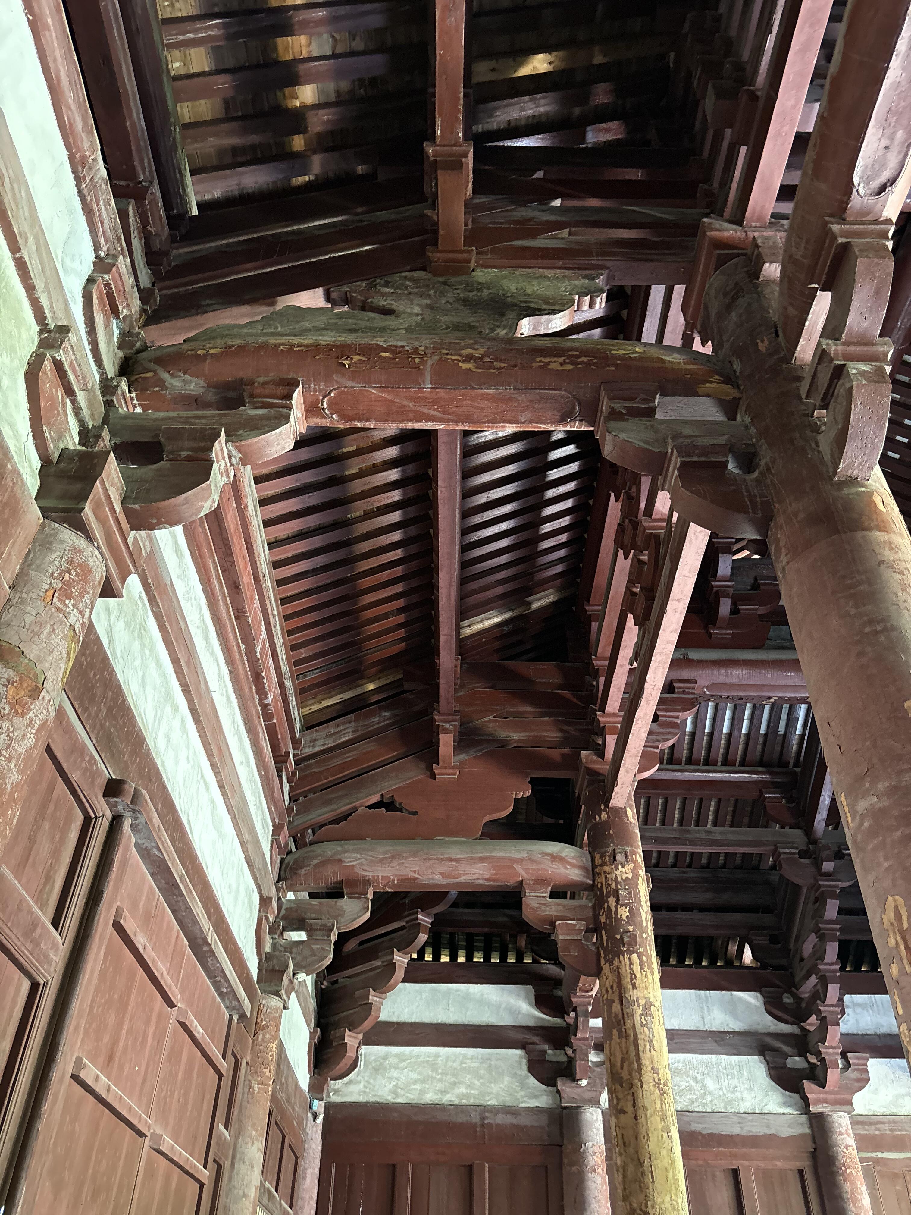 我凑到一根柱子前,仔细看柱身的纹路。木材的纹理像流动的河,有些地方还留着当年加工的痕迹,斧头砍过的印子、刨子推过的光面,都清晰可见。据说这大殿用的是“超一等用材”,在长江以南的古木结构里,算是顶尖的规格。难怪站在殿中,能感觉到一种无形的气场——不是宗教的肃穆,是木头本身的力量,是古人手艺里的底气。我试着用手量了量柱径,掌心贴上去,能摸到木材的温度,仿佛能听见千年前,工匠们叮叮当当的敲打声,能看见他们对着木料反复琢磨的模样。