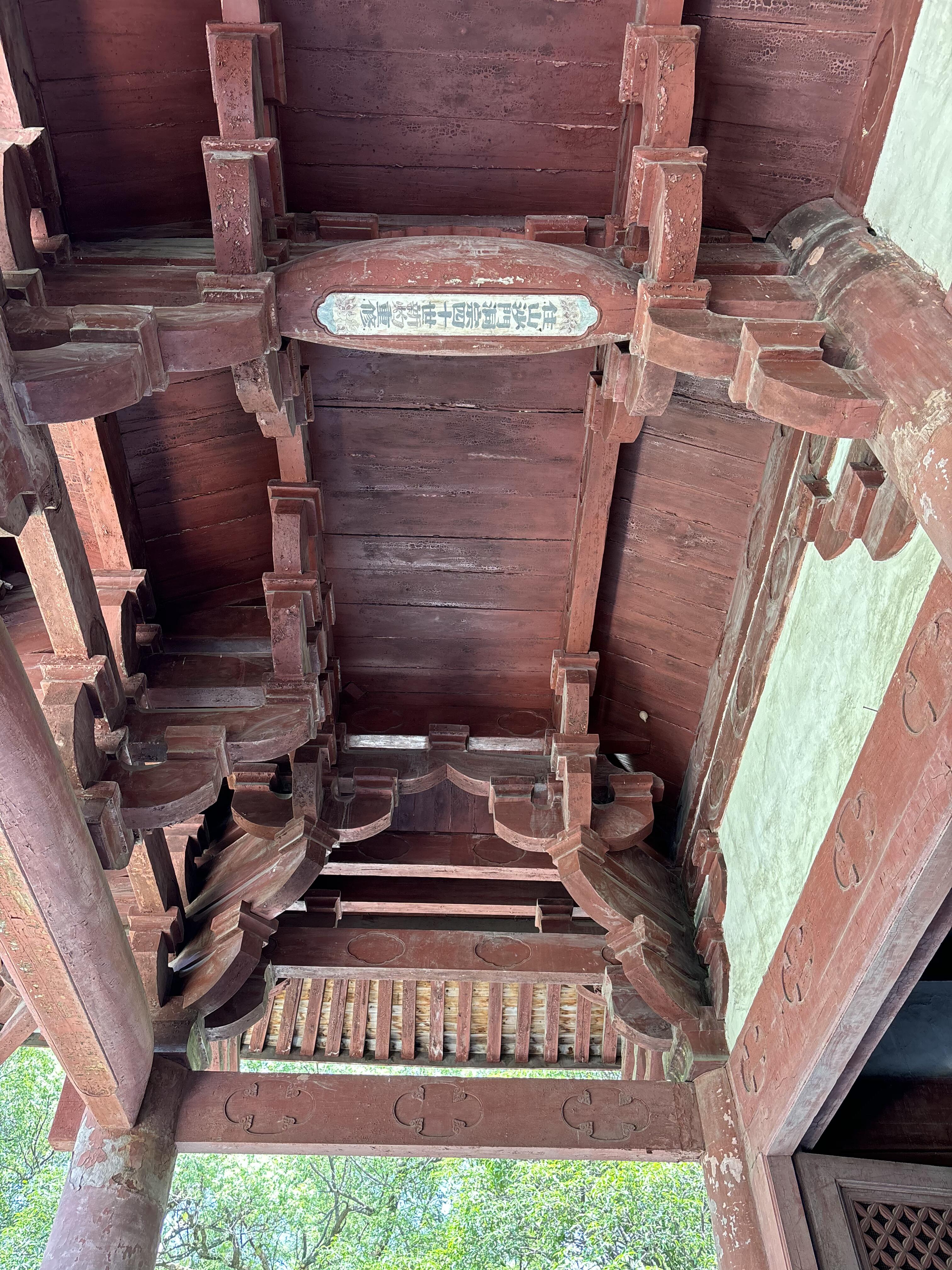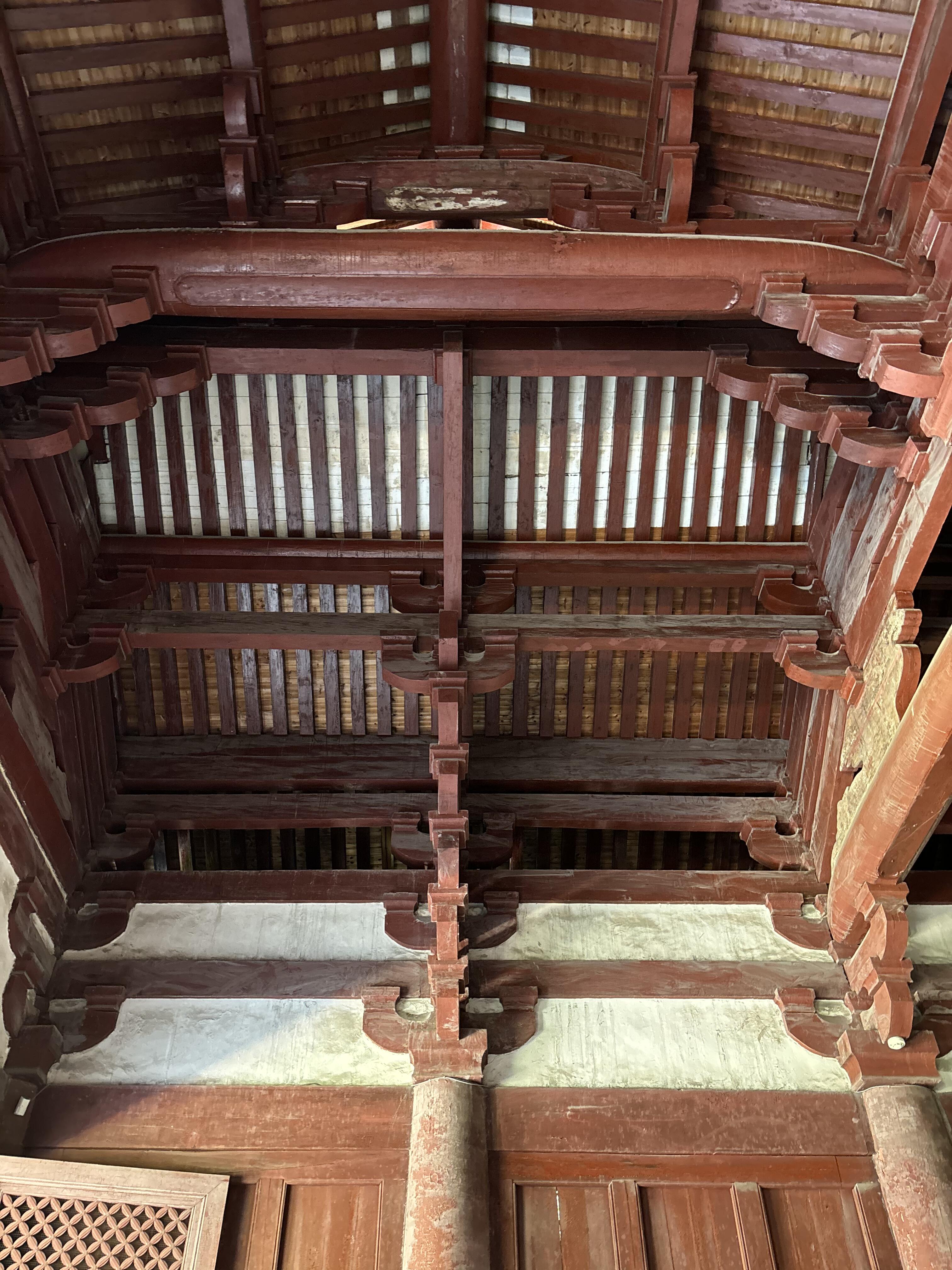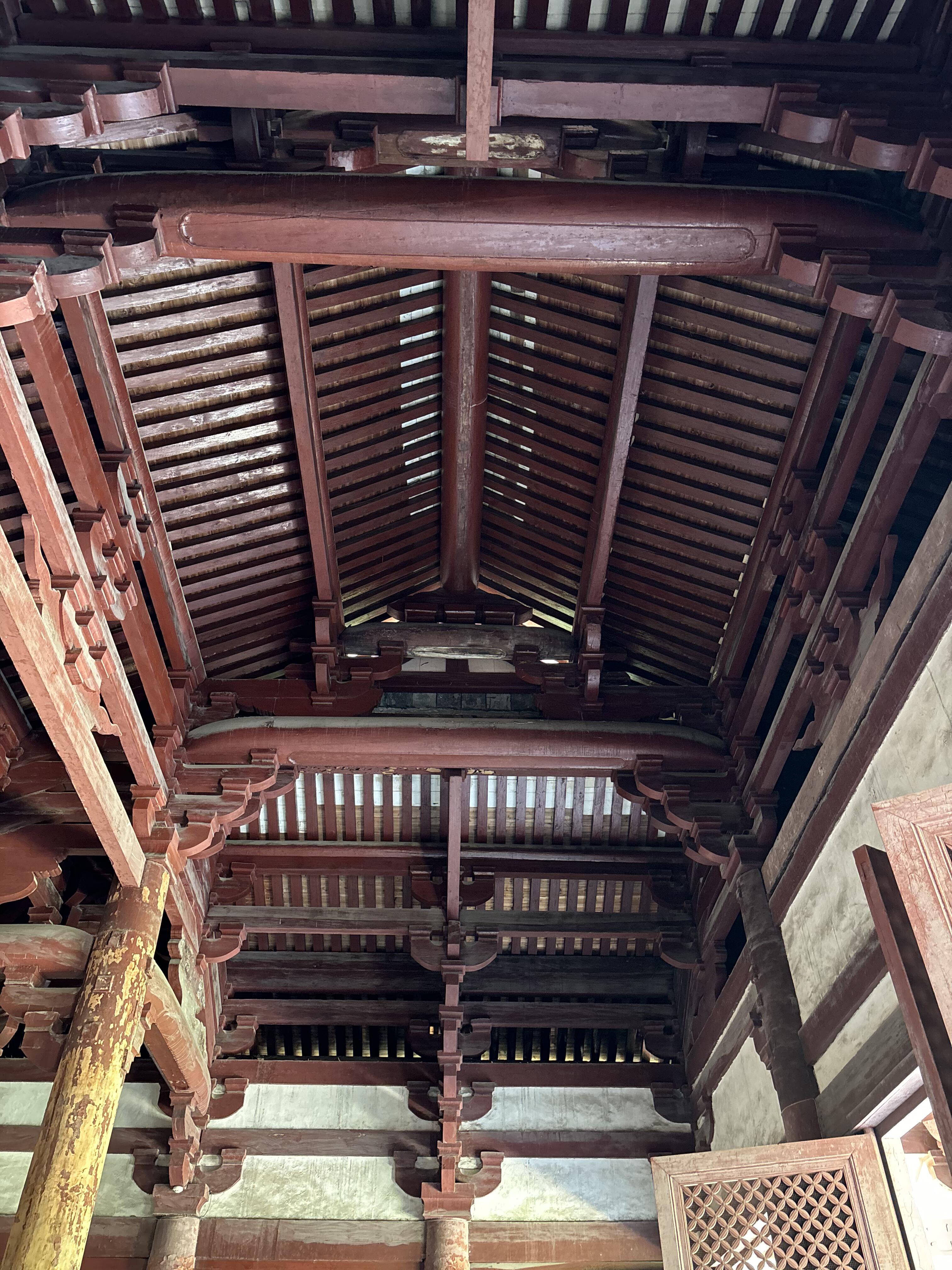 我凑到一根柱子前,仔细看柱身的纹路。木材的纹理像流动的河,有些地方还留着当年加工的痕迹,斧头砍过的印子、刨子推过的光面,都清晰可见。据说这大殿用的是“超一等用材”,在长江以南的古木结构里,算是顶尖的规格。难怪站在殿中,能感觉到一种无形的气场——不是宗教的肃穆,是木头本身的力量,是古人手艺里的底气。我试着用手量了量柱径,掌心贴上去,能摸到木材的温度,仿佛能听见千年前,工匠们叮叮当当的敲打声,能看见他们对着木料反复琢磨的模样。
