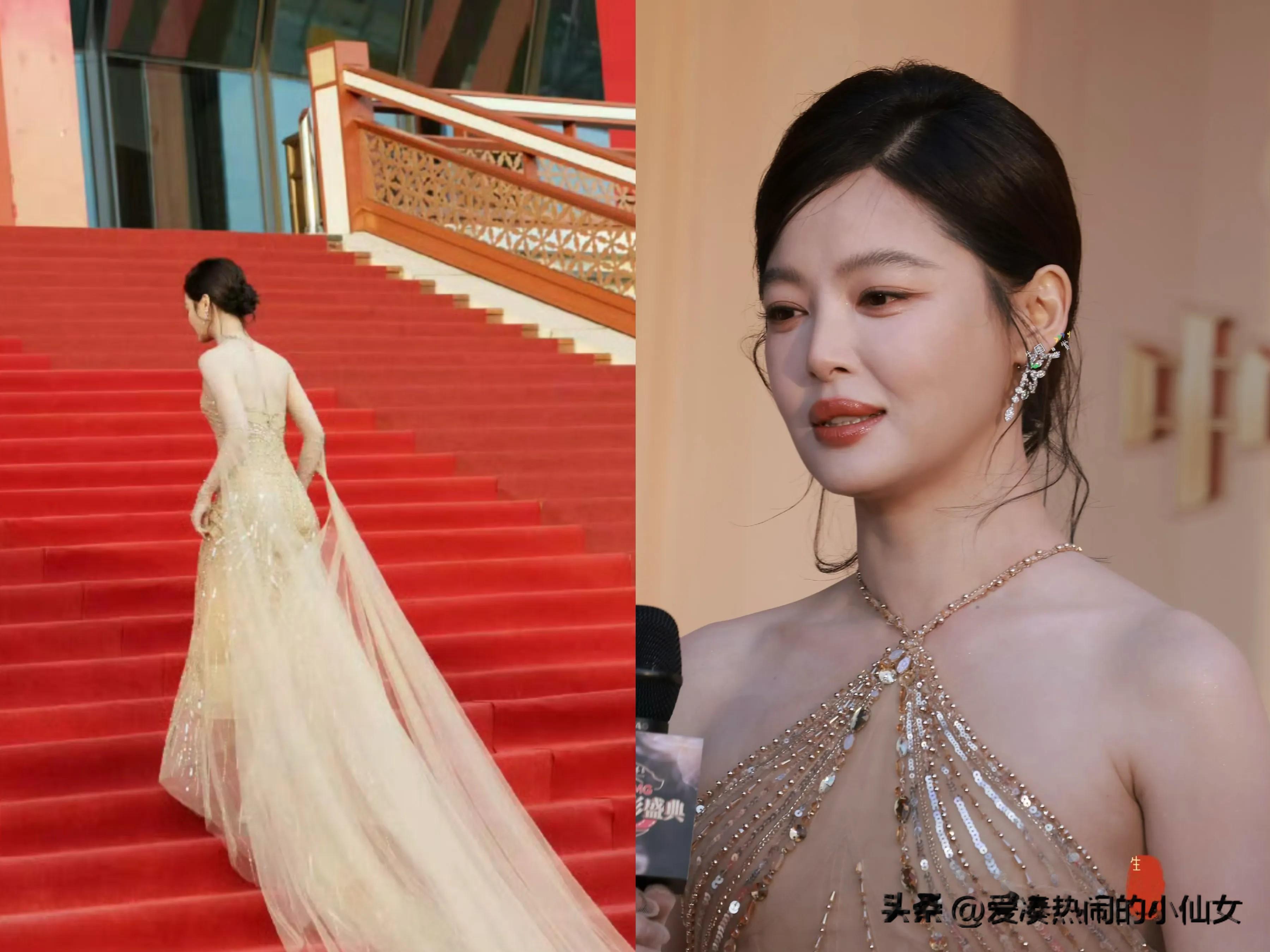 一身高定礼服的她,不光整个人有种珠圆玉润的光泽感,而且自信松弛,面对镜头游刃有余,相当有大花风范,连背影都美得发光!