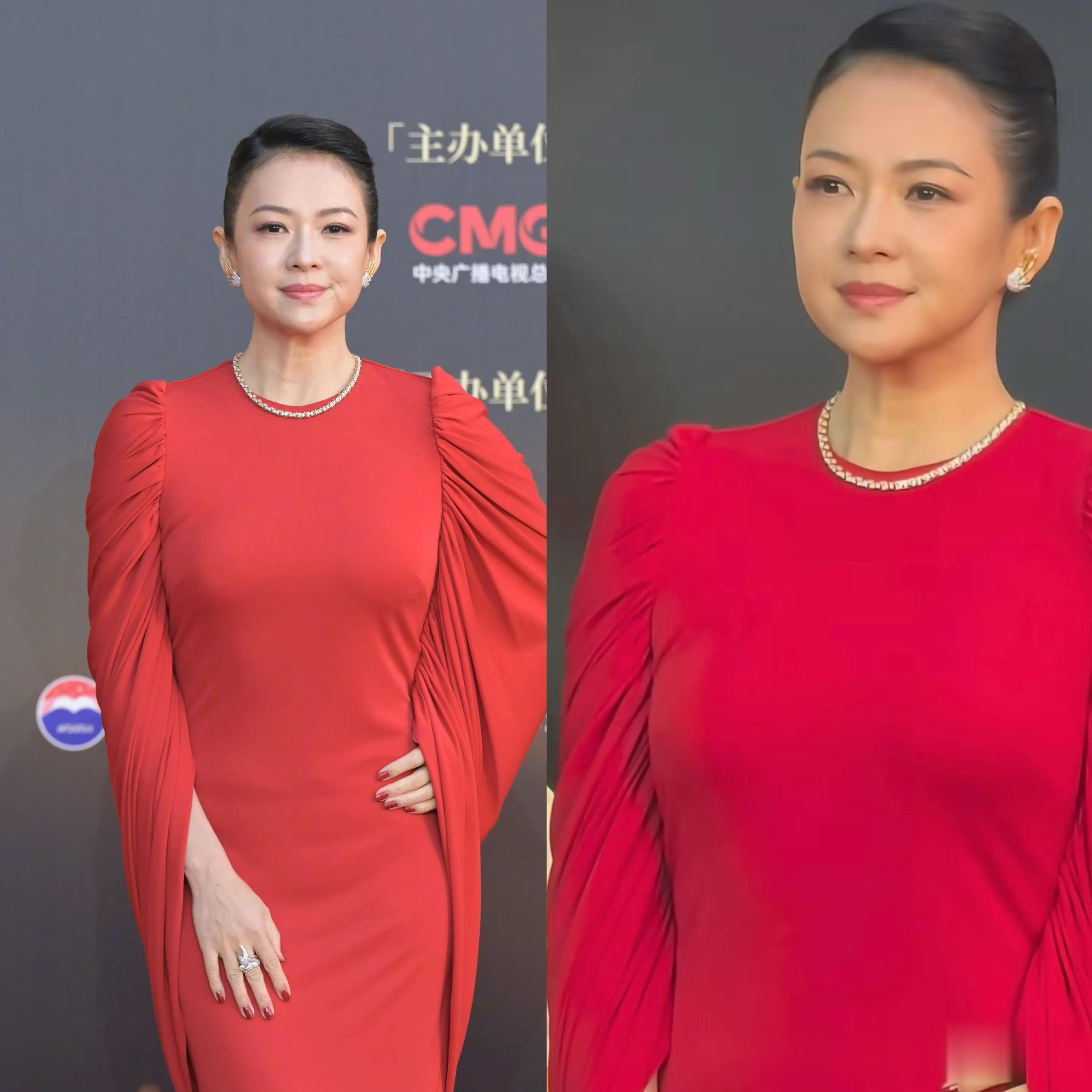 今晚,她穿的红色紧身褶皱裙,来自SEEN USERS金河礼服裙。这条裙子由于很贴身,裙子对身材的要求很高,而微胖的章子怡,显然并不适合。