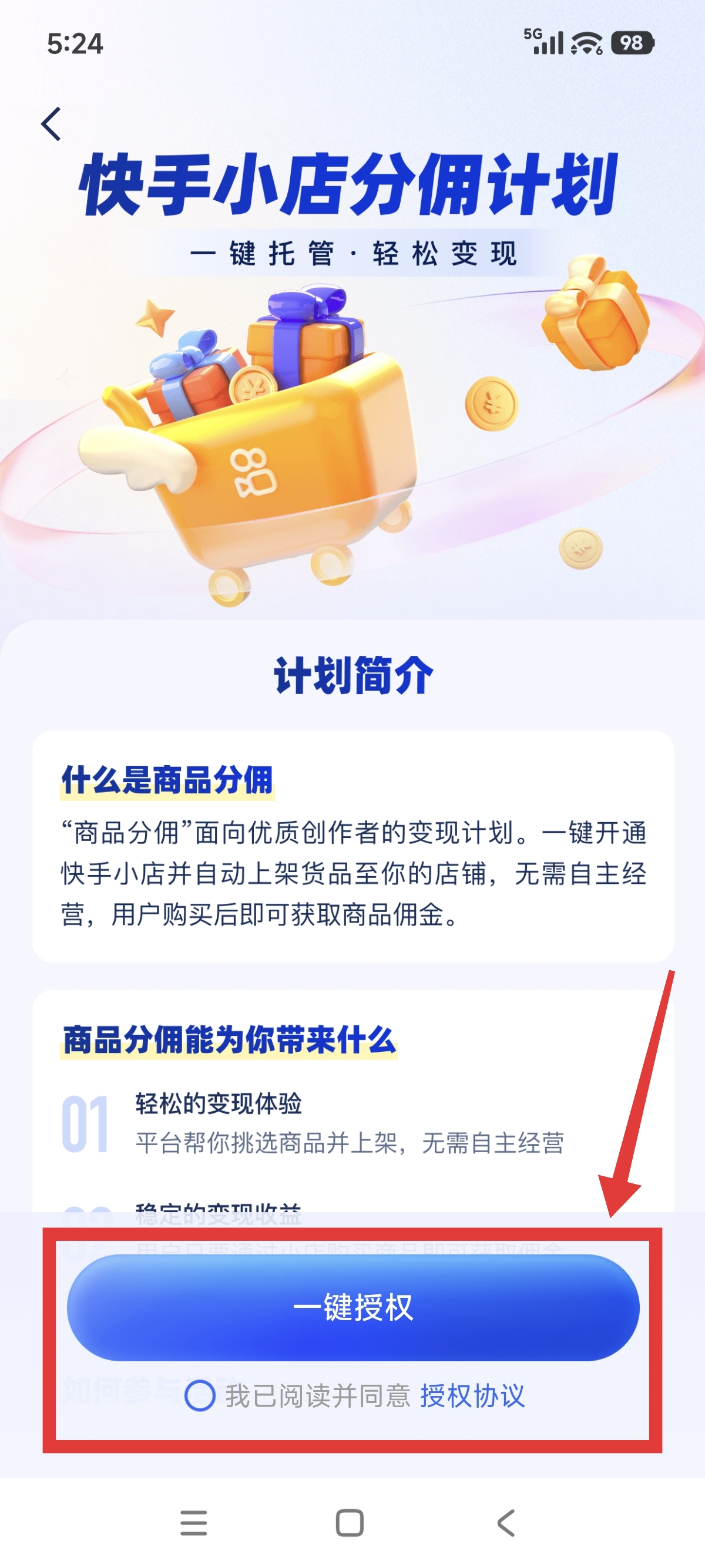 6.到快手小店分佣计划页面后,勾选(我已阅读并同意),然后点击(一键授权)按钮快手小店就托管了。