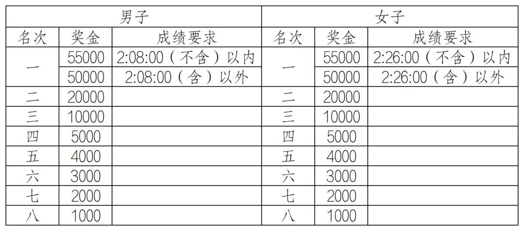 男子:2:07:18(不含)以内,奖励10000美元