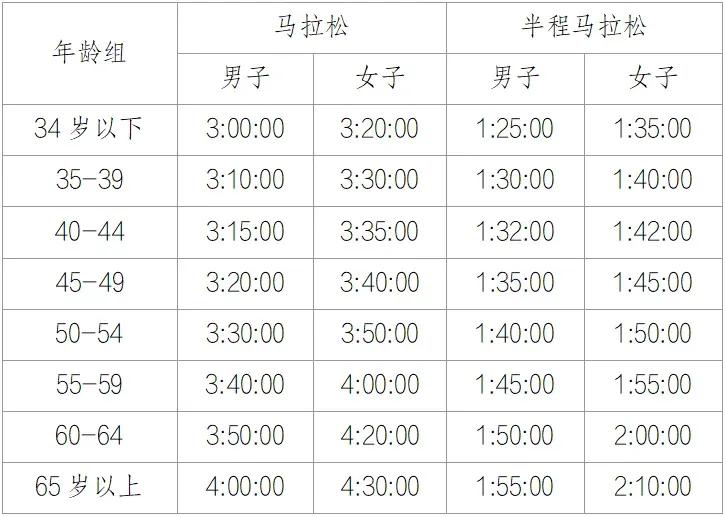 2、选手成绩若达到“2026重庆马拉松年龄组入围成绩标准”, 即可获得对应年龄组的直通入围资格;年龄组按2025减出生年进行划分,参考成绩如下——