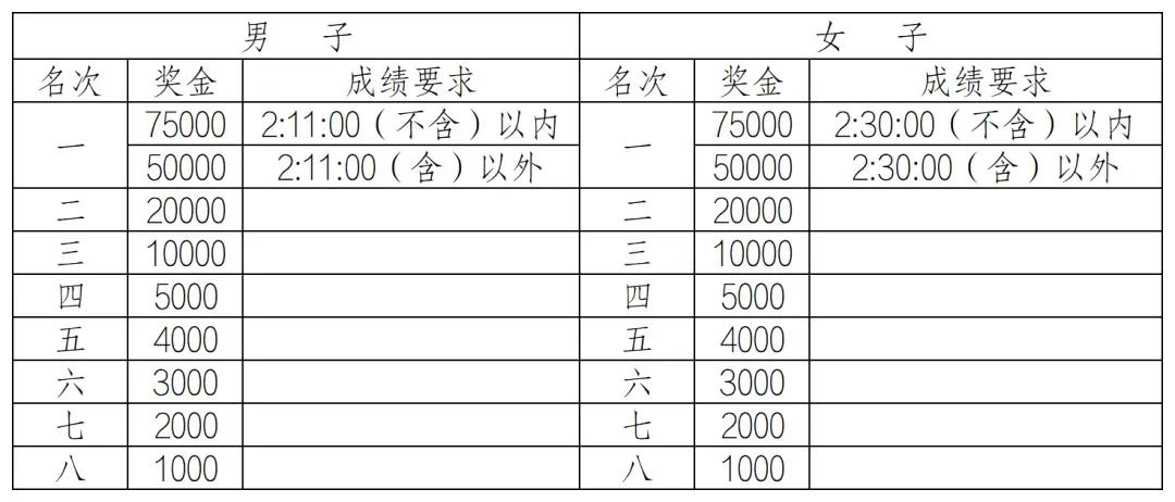 女子:2:21:27(不含)以内,奖励10000美元