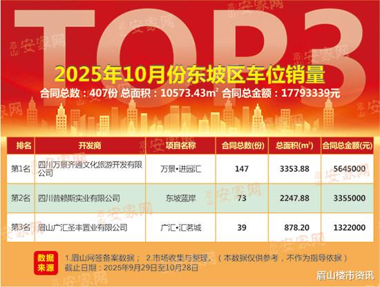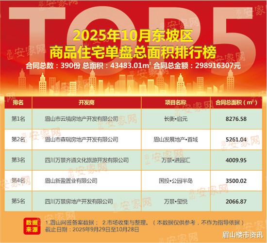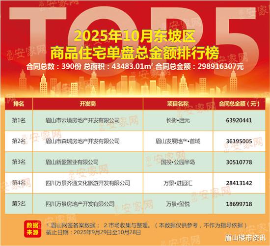 据眉山市网签备案数据及市场调研整理得出:2025年10月,新房住宅成交390套,成交总面积43483.01㎡,成交总金额29891.63万元;剔除江上名城少量房源特殊备案影响后,商品住宅成交均价为7301.87元/㎡。