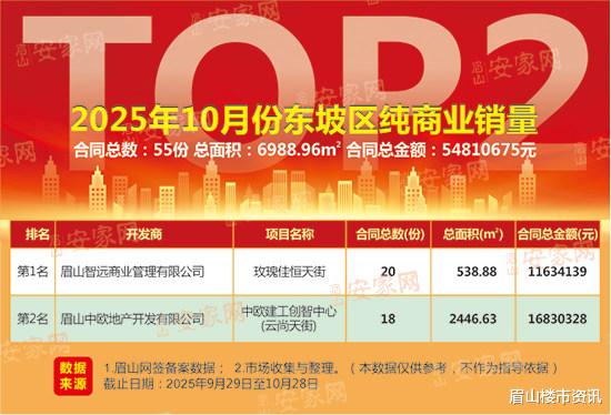 据眉山市网签备案数据及市场调研显示:2025年10月,商业成交55套,成交总面积6988.96㎡,成交总金额5481.07万元;成交均价为7842.46元/㎡。