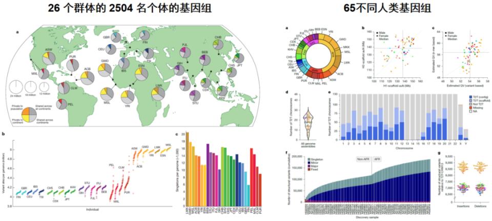在该计划取得成功的基础上,千人基因组计划于2007年启动,旨在通过对来自多个不同人群的多样化个体进行全基因组测序,全面描述人类常见的基因变异情况。该项目于2015年公布了来自不同种族背景的超过2504名个体的基因组,使我们对决定生理特征的遗传因素有了大量了解(图1)[1]。然而,遗传如何决定性状,不仅与传统遗传学相关,更与表观遗传学密切相关,涉及复制、转录、翻译、结构与修饰等过程。2003年启动的DNA元件百科全书计划,目标是建立一个详尽的人类基因组功能元件百科全书,包括基因、与基因调控相关的生化区域(如转录因子结合位点、开放染色质和组蛋白标记)和转录异构体,将研究视野从编码区域拓展至非编码区域[2]。