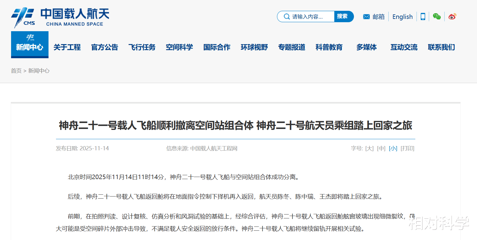 根据中国载人航天办公室,神舟二十一号在11月14日11时14分成功撤离空间站。而东风着陆场的禁航通告显示,飞船将在16:20至16:50降落,具体来说可能在16:34前后降落。