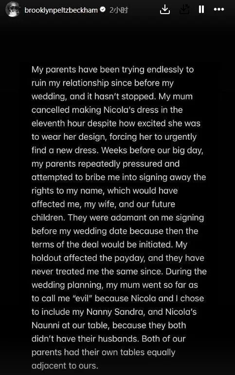 今天,贝克汉姆长子布鲁克林在社媒更新长文,指责贝克汉姆和贝嫂维多利亚一直试图破坏他和妻子的感情关系,并表示他们为了维护自己的表象,不惜在媒体上散布大量谎言。