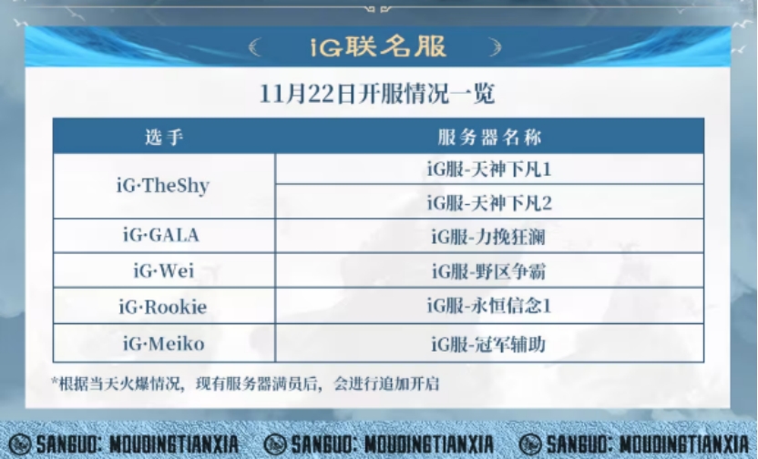 对电竞粉丝来说,“和iG选手一起开黑”是个“想起来就开心”的事——现在这个事能实现了,只不过战场从峡谷换到了三国。11月22日,《三国:谋定天下》要和iG电子竞技俱乐部开启联名服,五位明星选手会入驻游戏,和玩家一起在三国战场上“开黑”。平时在峡谷里操作英雄的TheShy、Wei等人,这次要换个方式和你一起“组队”,用兵法和武将征服天下。