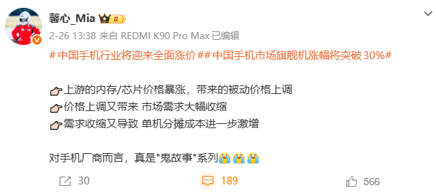 就连小米高管@馨心_Mia 都忍不住诉苦:“上游的内存/芯片价格暴涨,带来的被动价格上调;价格上调又带来市场需求大幅收缩;需求收缩又导致单机分摊成本进一步激增。对手机厂商而言,真是"鬼故事"系列”。