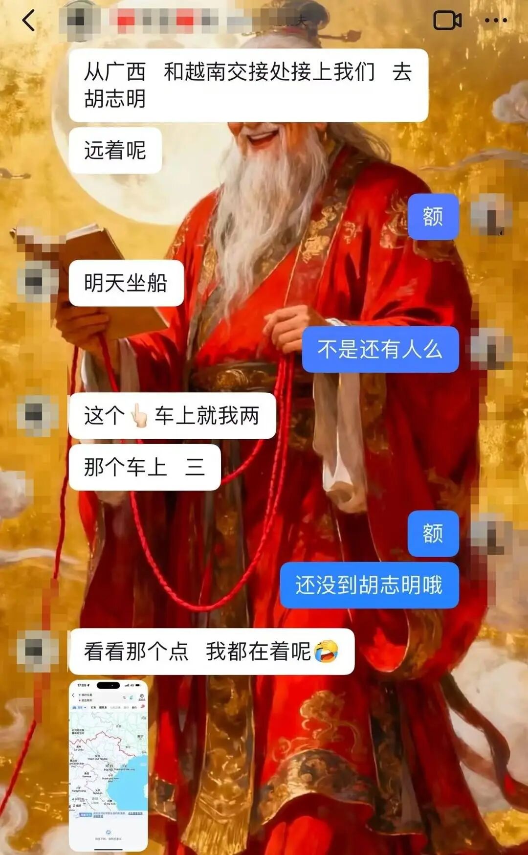 9月29日早上,其朋友询问:“走到哪儿了?”唐怀超在8时06分回复:“下午到西港口。”随后,他给朋友发送了一张水印相机拍摄的自拍照,照片显示其位置已在越南境内。