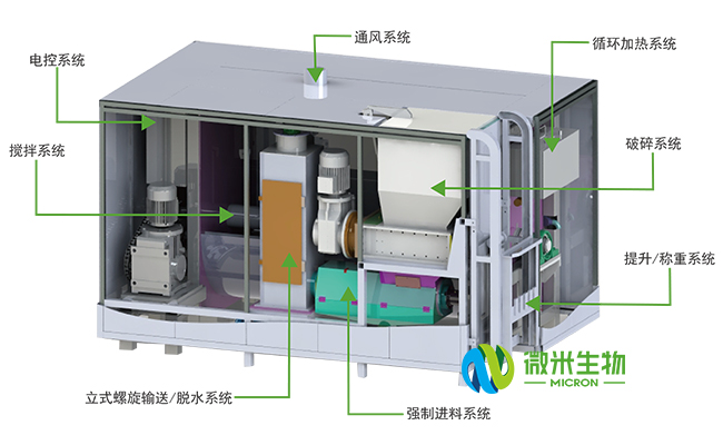 以微米生物有机垃圾处理一体机为例,它是一种专用于有机垃圾发酵处理的一体化设备,具有提升、称重、破碎、冲洗、脱水、好氧发酵及自动控制等功能,是实现“无害化、减量化、资源化”处理的必要设备,接下来,我们来看看设备的构成和特点: