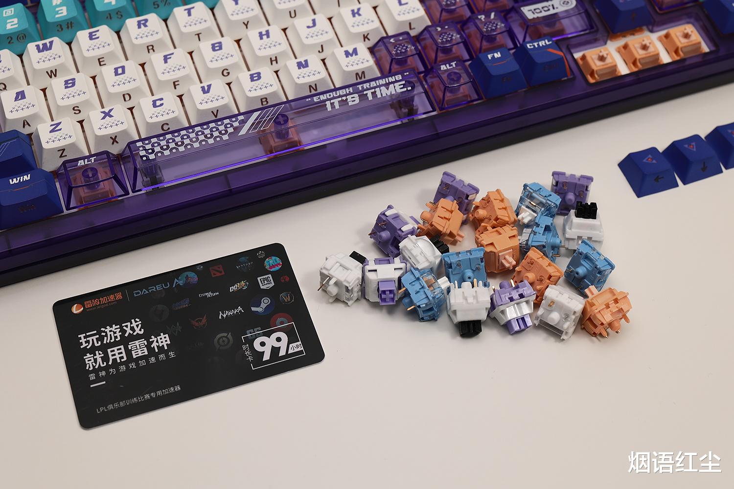达尔优COOL98键盘由纸质盒包装,整体包含键盘、数据线、二合一拔轴拔键器和说明书。值得一提的是,优尔优诚意满满,随键盘还附送了一块大鼠标垫,一大把各种轴体,还有一张雷神加速器的时间卡,特别贴心。
