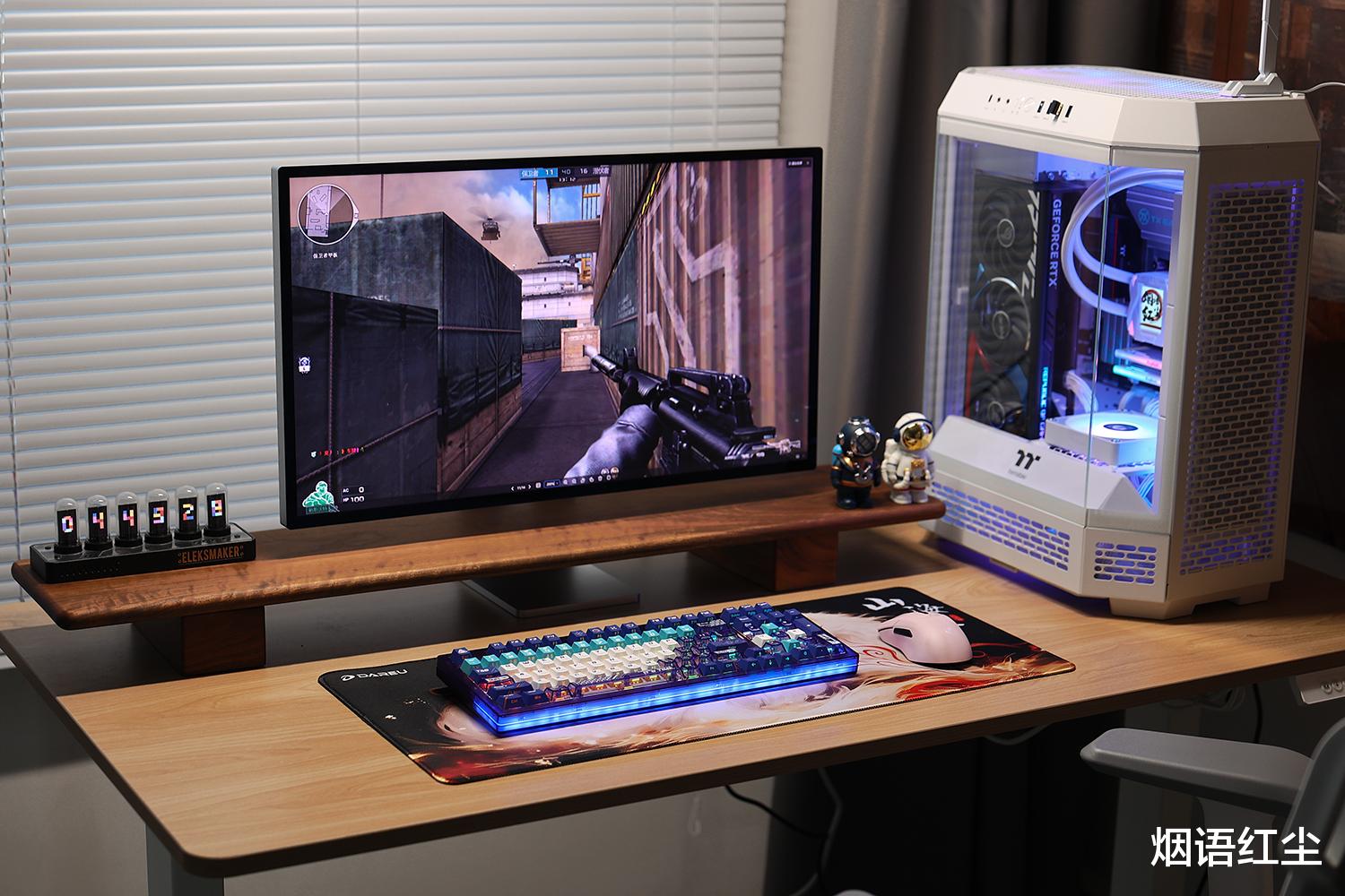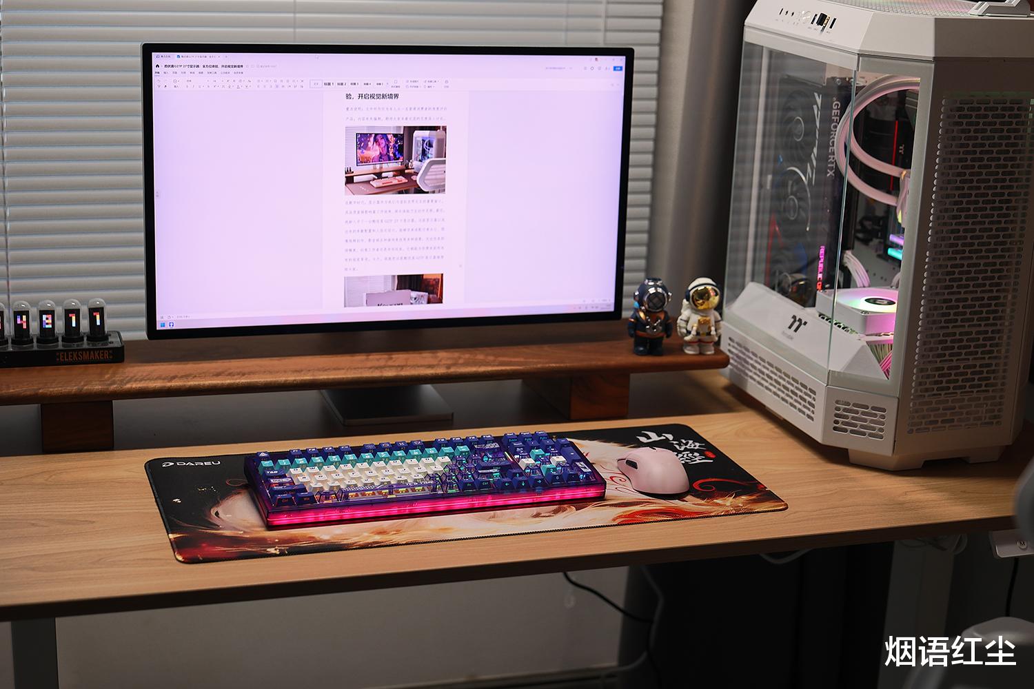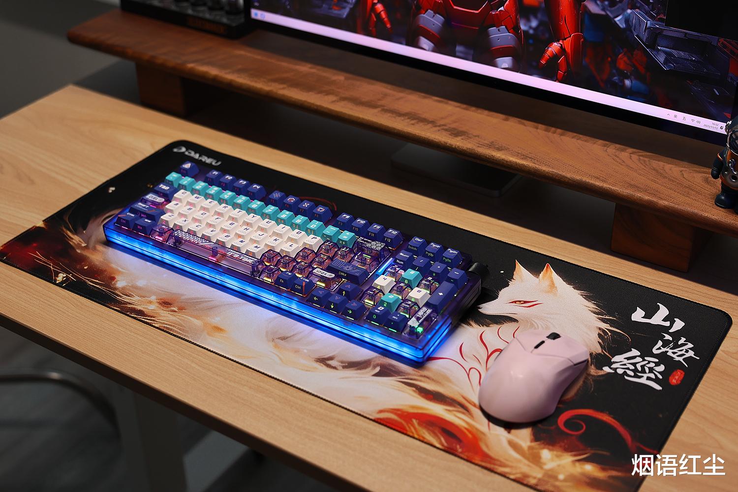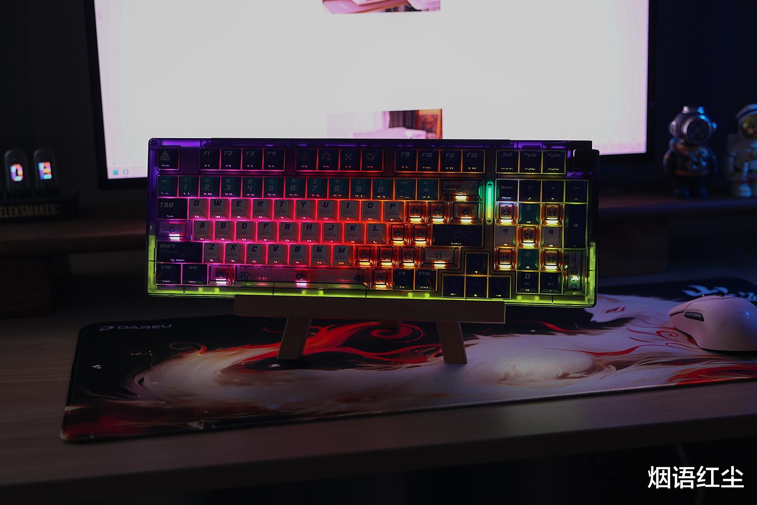 最吸引我的是达尔优COOL98键盘前端180°环绕的星环氛围灯带,它拥有4种RGB流光灯效,与键盘本身的10种灯效组合,打造出沉浸式的桌搭体验。无论是在白天还是夜晚,这种柔和而不张扬的光效都能为桌面增添一抹科技美感。