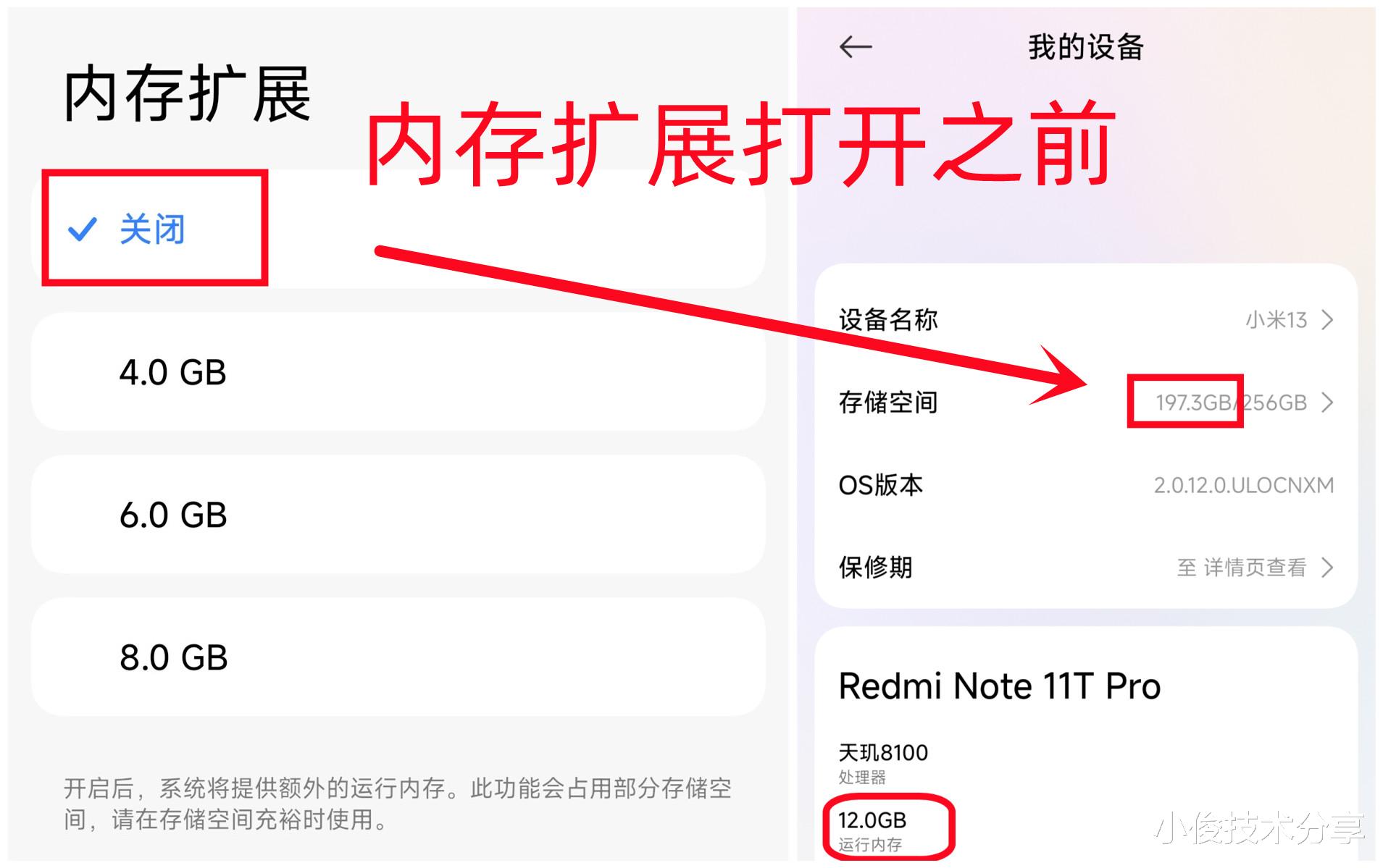 而我没打开内存扩展之前,手机运行内存12G,但是存储空间,已用空间是197.3G