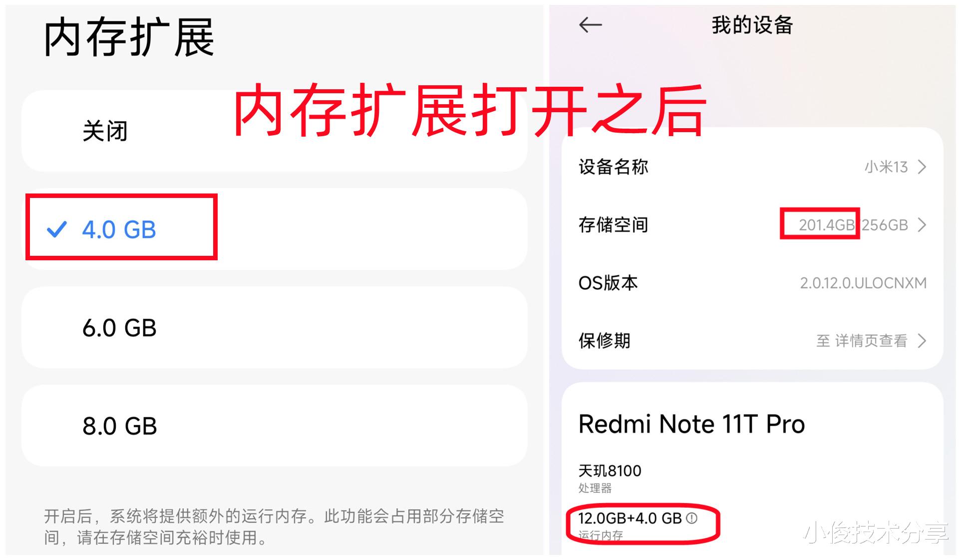 可以看到,我打开内存扩展之后,手机的运行内存变成了12+4Gb,而存储空间,变成了已用201G