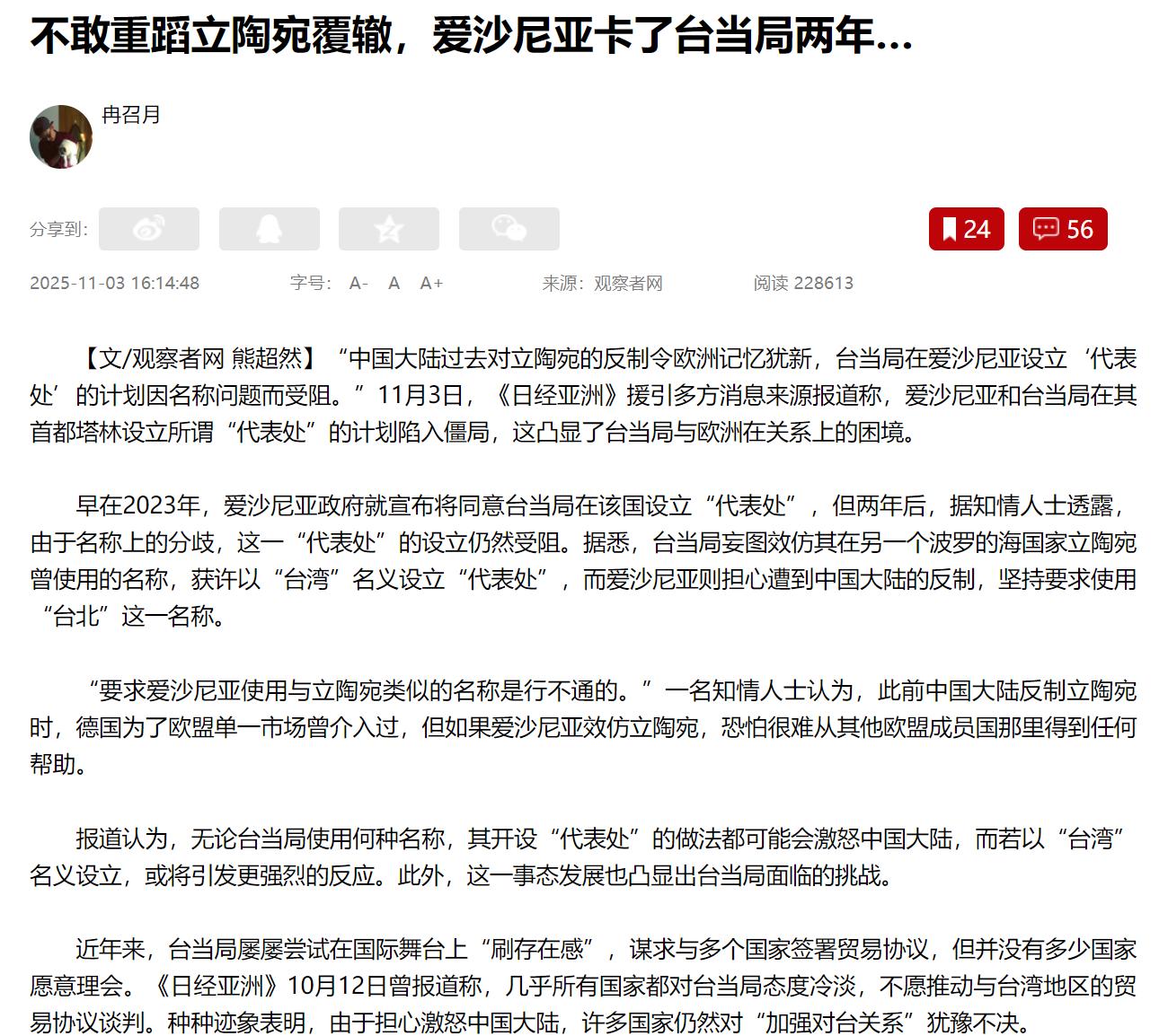 日前,日媒爆料称,尽管爱沙尼亚接受台当局在塔林设置“代表处”被搁置,但是民进党一直未放弃,只不过双方在名称上陷入了分歧,爱沙尼亚政府只接受以“台北代表处”为名,但台当局坚持效仿立陶宛,设置所谓的“台湾代表处”。