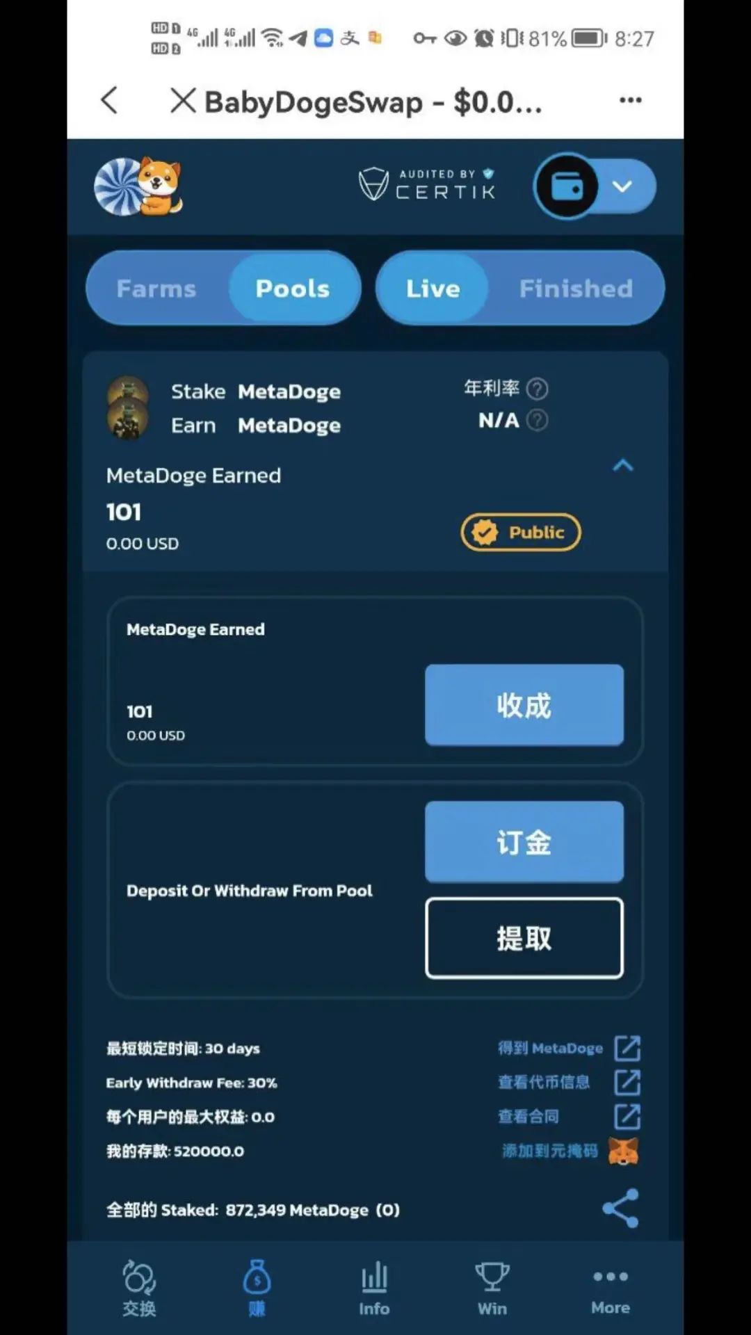 1、在BaByDogeSwap,将手头的元狗币metadoge进行单币质押,就可以获得元狗币的质押奖励;