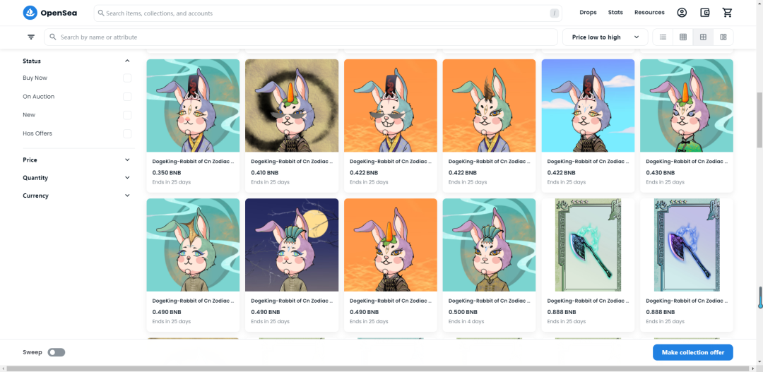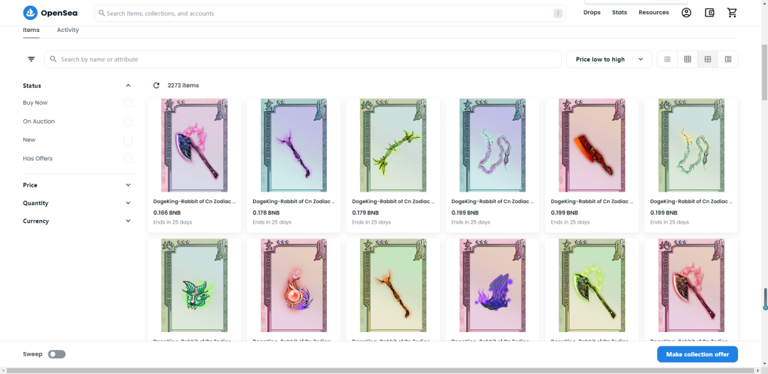 武器类:1900张,分天地玄黄四个类别,出的是1-5星级的各类武器、装饰物,与4月份将推出的链游有很大的挂钩,目前5星级武器nft价格已经达到0.5b;