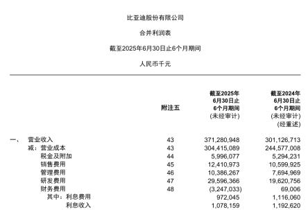 8月29日晚,比亚迪披露的2025年半年报中显示,公司实现营业收入3712.81亿元,同比增长23.3%;归母净利润155.1亿元,同比增长13.79%,两项指标均创同期新高。