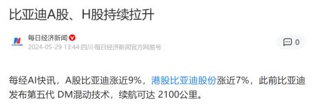 2024年5月28日,首搭该技术的秦L DM-i和海豹06 DM-i以9.98万元的起售价上市,其“满油满电2100公里”的超长续航和震撼价格,让比亚迪A股、港股股价双双齐涨。