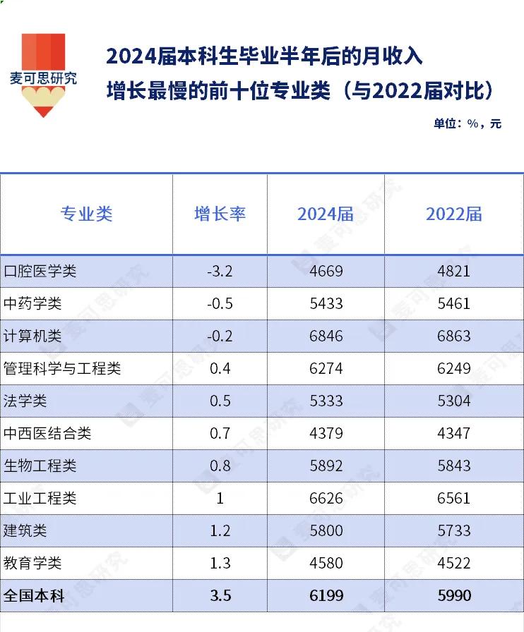 相比之下,同期多数专业类的月收入仍保持增长。例如,工业工程类增长1.0%,建筑类增长1.2%,教育学类增长1.3%。全国本科平均月收入则从5990元增长至6199元,增幅为3.5%。