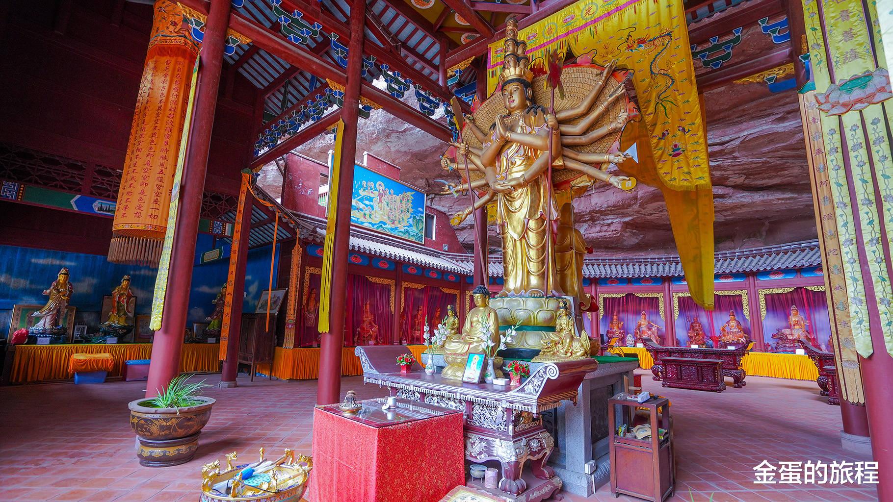 寺内最让我驻足良久的,是供奉于主殿岩洞内的千手观音像,高数丈,金身庄严,面容柔和,气韵生动。塑像背后即为天然岩壁,其上常年有山泉细流垂落洞前,晴日不绝,宛如瀑布。岩壁四周青苔常湿,洞中终年清凉湿润,环境空灵清净,更显佛像之庄严神圣。