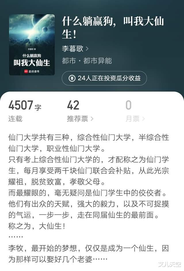 除了老王今天开了新书,发现李暮歌也在今天又开了一本都市修仙文新书《什么躺赢狗,叫我大仙生!》,原本我还以为他上本都市文改名宣传了的,结果是那本都市文直接切了,另开新坑了。