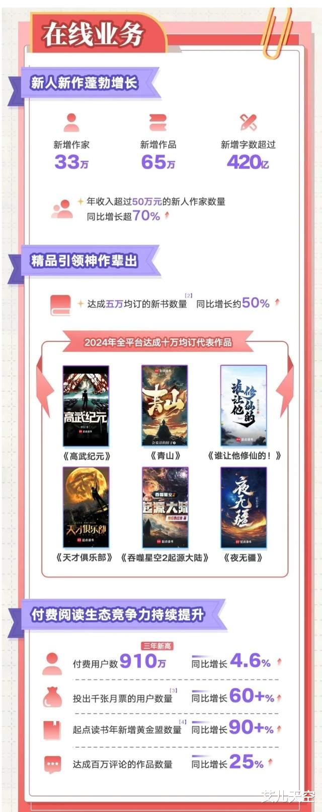 下面投出千张月票的用户数量暴增显然是跟去年诸多作品参与进了月票刷榜有关的,单月单账号破千的着实不少。后面打榜还闹出了乱子,倒逼起点改革月票榜,这业绩报告上拿这个注水数据出来作为付费阅读生态竞争力持续提升的一个指标,看着挺有乐子的。