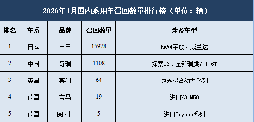 据国家市场监督管理总局缺陷产品管理中心数据,1月共发布乘用车召回公告6则,召回乘用车共计1.72万辆,召回量环比2025年12月减少91.38%。其中,日系品牌丰田召回1.60万辆,占当月召回总量的93.04%;华系品牌奇瑞召回1,108辆,占比6.45%;英系品牌宾利召回64辆,占比0.37%;德系品牌保时捷召回5辆,占比0.14%。