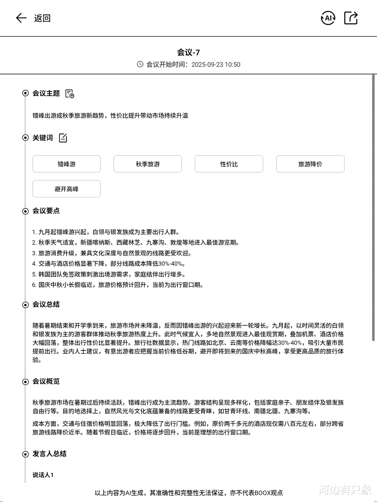 只有识别可不够,Ai时代的会议整理也要安排上,不论是会议主题还是会议总结与关键词都能总结到位。