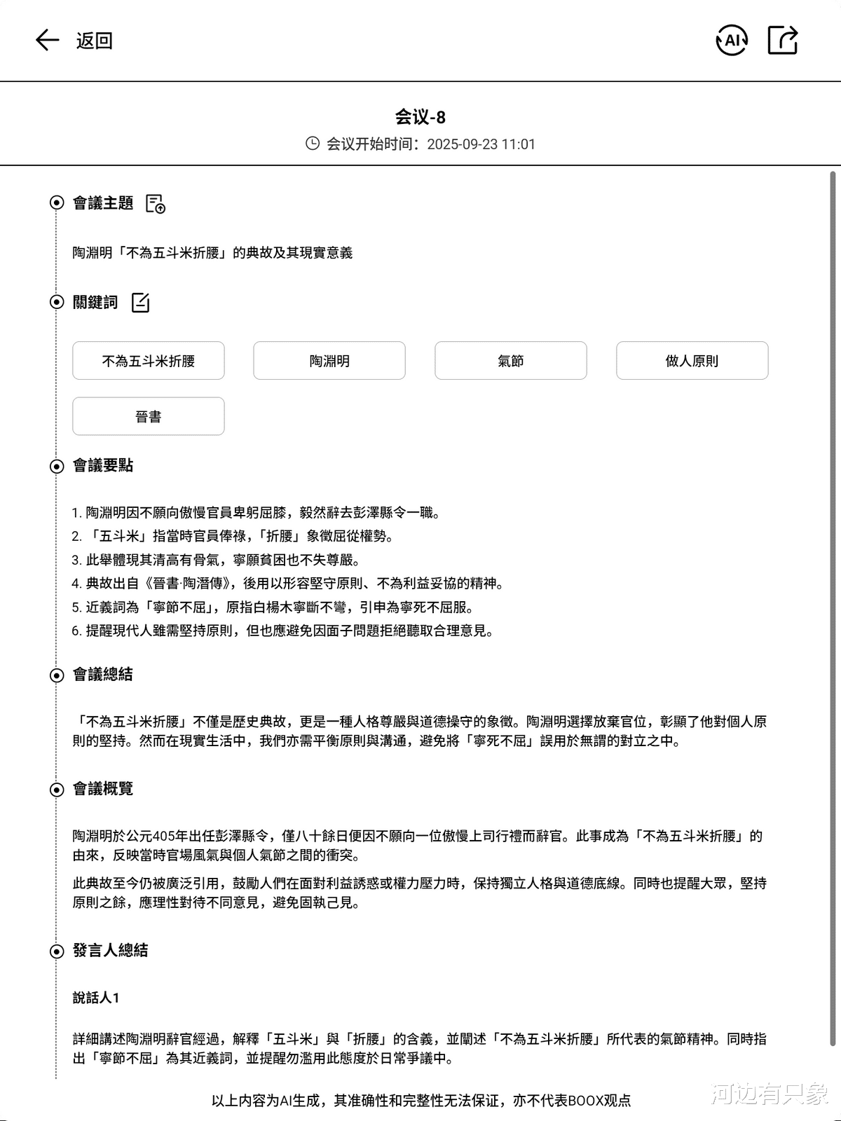 不过两成识别有误的字眼也不影响最后Ai的会议总结,我们可以看到总结依然非常到位,包括最后提到的不要滥用这个点都标注出来了。