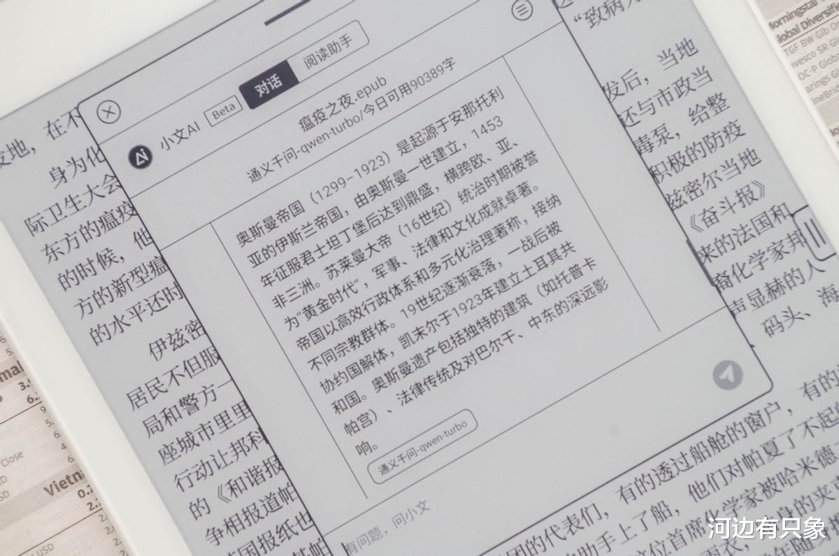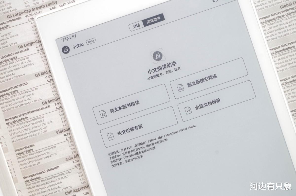 除了记录笔记和会议,有时候我们也需要整理大量的文本,文石在新系统中把这个功能从阅读引擎中迁移到「小文AI」应用上面,阅读助手支持多种不同格式的文件的Ai解析功能。大象这里需要提醒一下,这个功能依赖服务器在线,对于敏感和涉密文件要在确认许可后使用这个功能。