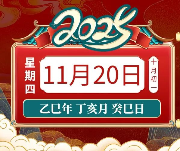 2025年11月20日,星期四,农历十月初一 (乙巳年丁亥月癸巳日),法定工作日。
