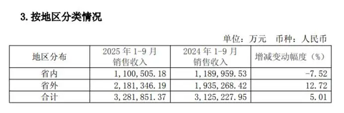 值得注意的是,增速放缓的同时汾酒的发展结构也在不断优化,全国化战略的实施是其“以退为进”的最佳体现。2025年前三季度,汾酒省外市场销售收入达218.13亿元,同比增长12.72%。